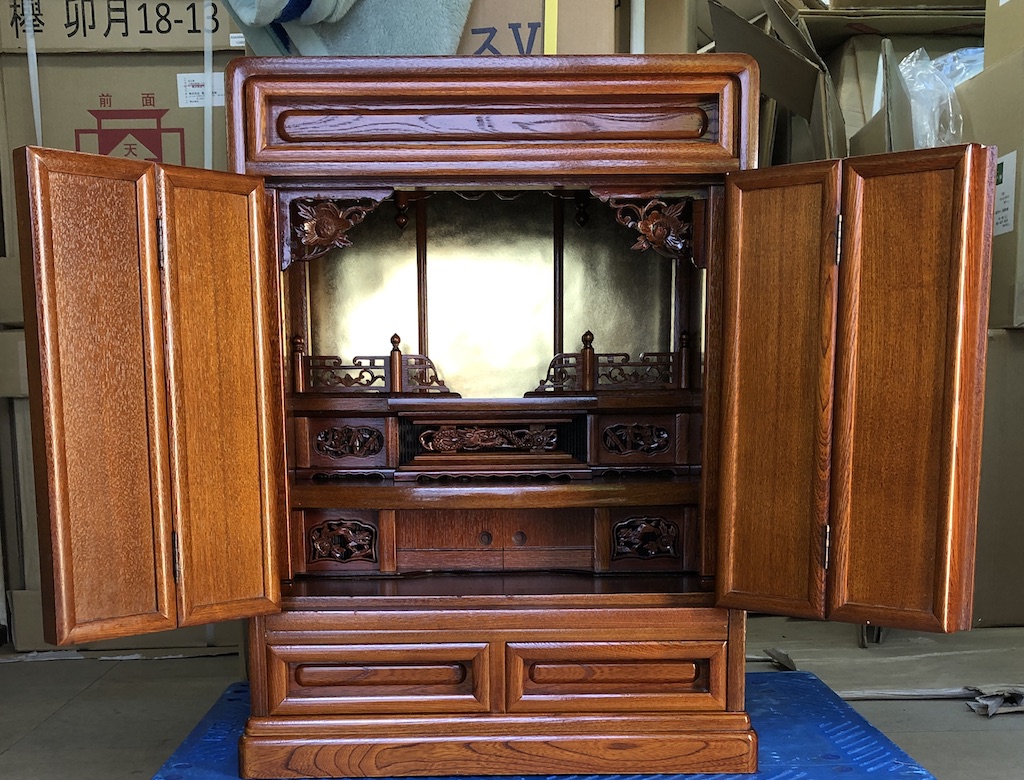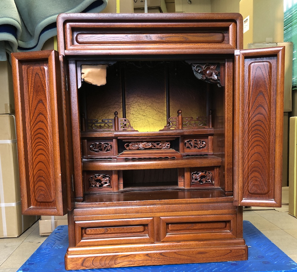 仏壇洗浄 黒瀬様 befor after欄間等細工を施した仏壇 欄間下左の部分が欠けてバラバラになっていました。おじいちゃんが購入した仏壇なので新品に買い換えるのでは無くてこの仏壇を直して使いたいとのご依頼でした。部品から直すのであれば新品仕上げをおすすめしますが、なるべく低予算でということでしたので部品を繋げて、足りないところは盛り土風にうまく押さえ込みました。近くで見てもあまりわからないと思います。あとは通常の洗浄と金紙を交換して艶出しすれば随分雰囲気が変わります。黒瀬様には大変喜ばれておりました。