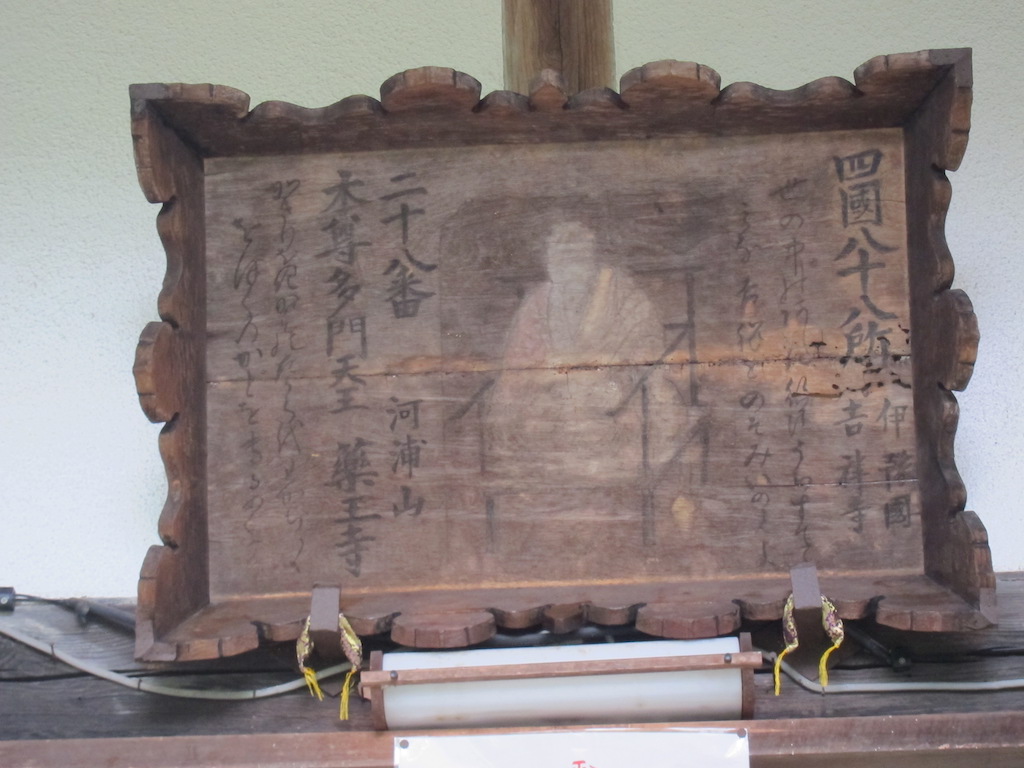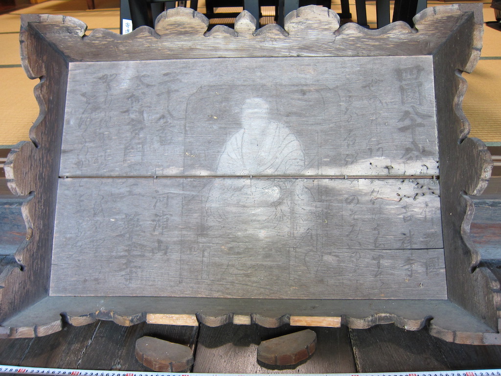 高野山真言宗 薬王寺様 弘法大師額 after洗浄 額が落ちてきて割れたから何とかして欲しいと修理依頼でした。条件がいまの感じをそのままに。経年劣化があるのでほんの少しだけ字だけはわかりやすいように墨をいれました。弘法大師様はだいたい朱に近いオレンジなので薄く色を入れようかとも考えましたが、汚れを取ったらそのままでいいとのことでしたので、そのまま元あったところに設置しました。違和感なくて字が読めるようになって前より良くなったとお褒めの言葉をいただきました。