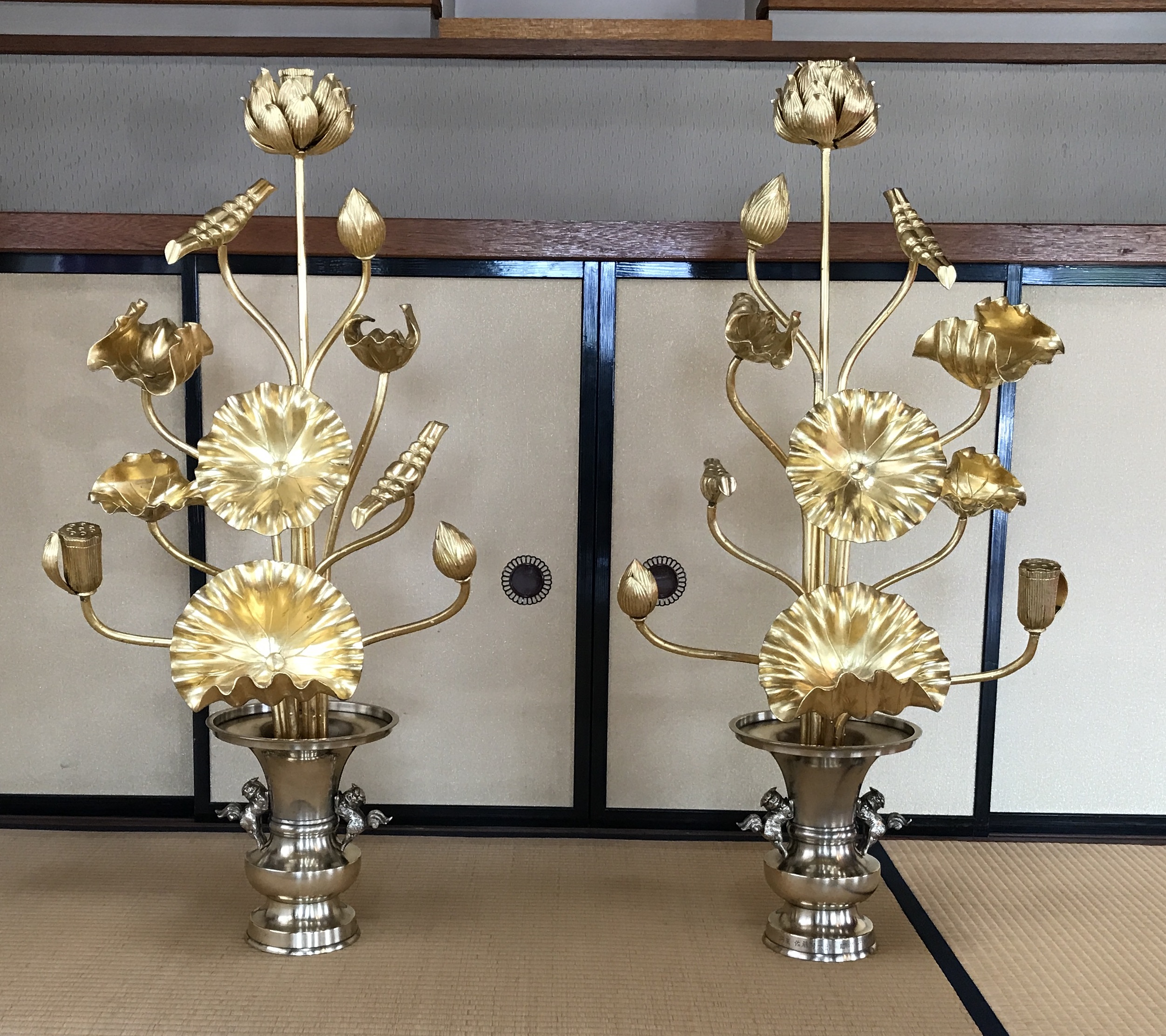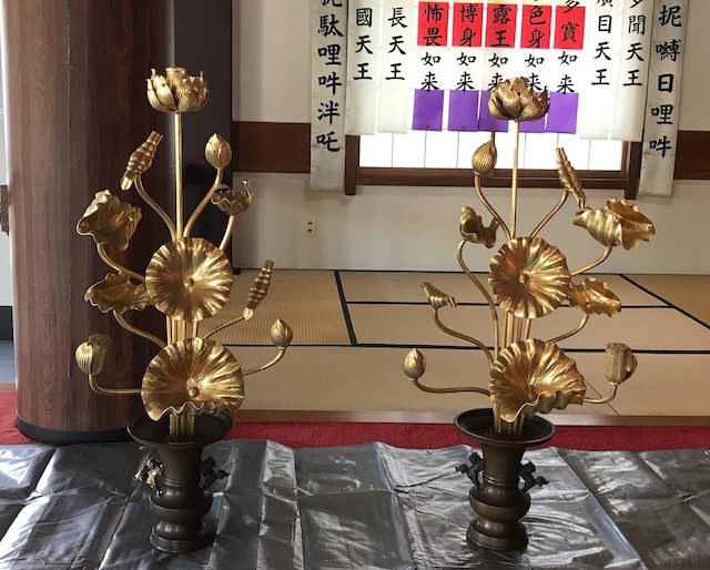 数年ぶりに方丈さんから連絡があり本堂を建て替えるので常花を綺麗にしたいとご依頼がありました。常花は傷んでなさそうだったので問題なく洗浄出来ました。花立は一瞬宣徳(茶色の焼き付け塗装)かと思いましたが怪しいので両脇の獅子の金具を外してみました。すると、やはり真鍮色が隠れていました。どうやら宣徳ではなくて経年劣化で茶色く変色していそうでした。特殊な還元剤を使用してから洗浄後磨きをかけたらすっかり元に戻りました。方丈さんもびっくりしていました。忘れずに声をかけてくださって本当にありがとうございます。
