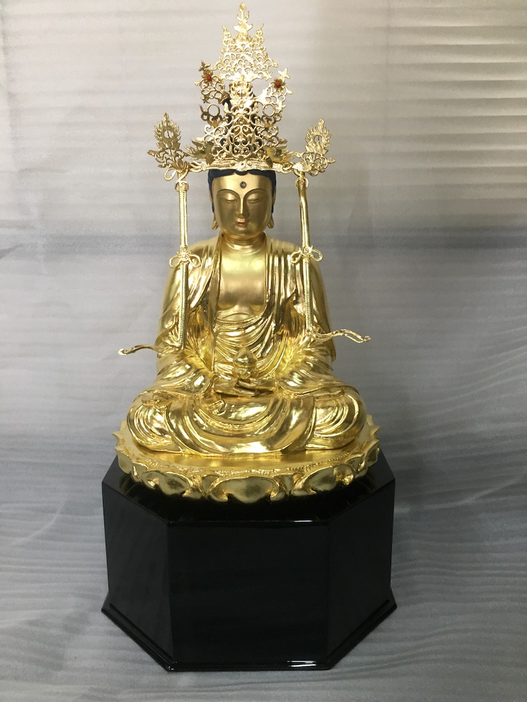 仏像がネズミにかじられることはよくあります。他のところをかじればいいのにと思うのですが好きみたいです。今回の菩薩様もいろいろな箇所がかじられてました。また寄木造りなので前のパーツが無くなっていました。すべて修復して金箔を押し直しました。台座が無いので簡単な形で作って欲しいとの事でしたので製作しました。随分綺麗に生まれ変わったねと大変喜ばれておりました。