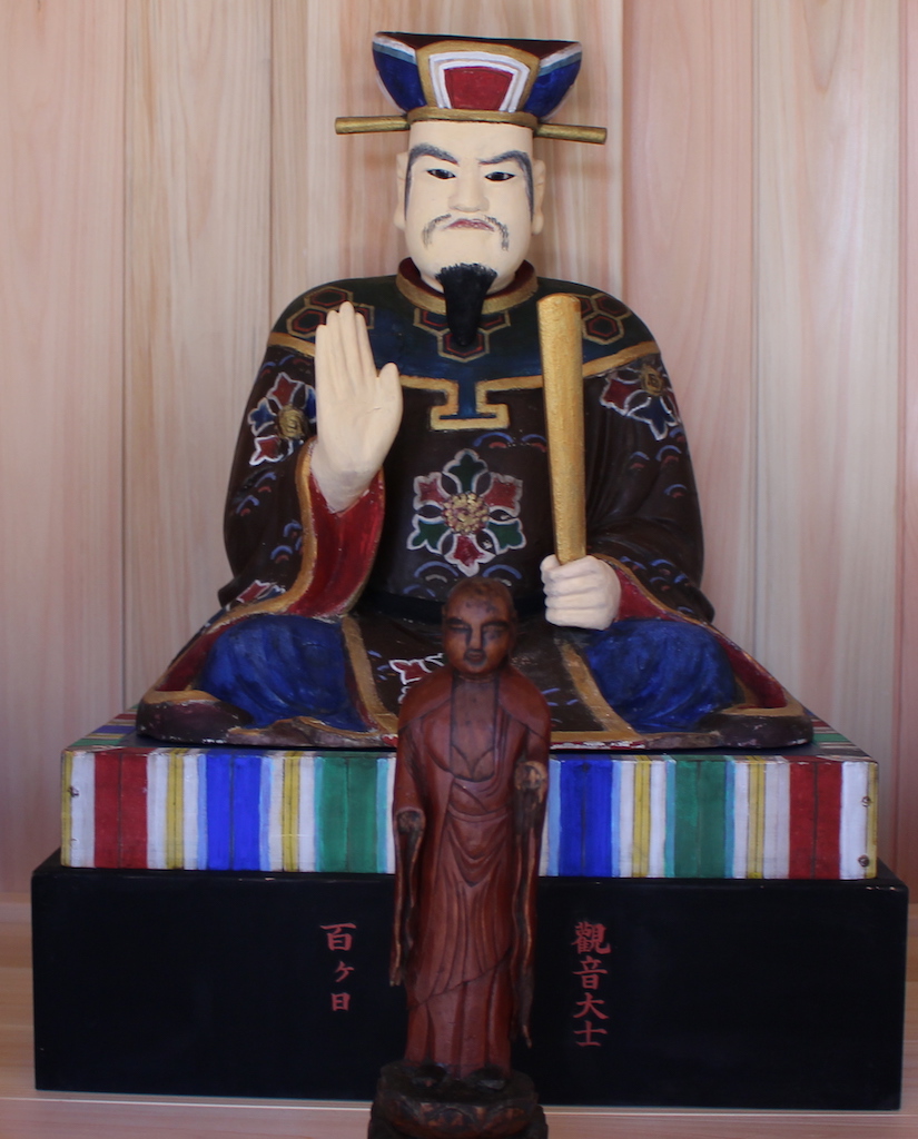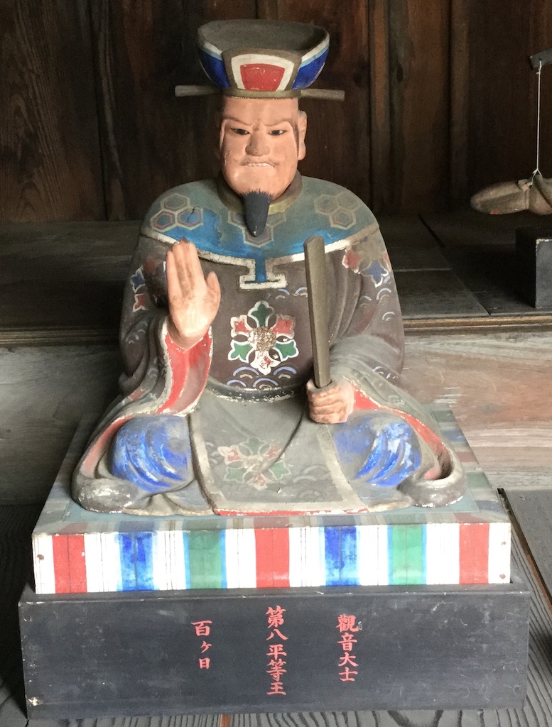 時間が経過したなりに綺麗にして欲しいとご依頼を受けました。閻魔様は団体様でいらっしゃるので一部の方が劣化が激しいとどうしてもそちらにつられて彩色を施さなければならなくなります。この平等王像は比較的劣化が進んでいませんでした。埃は上から降ってくるので、頭、肩、膝上あたりはどれも汚れがコビリついています。こういうものを加減しながら洗浄し、その後保護しながら、最後に少しづつ違和感ないように彩色補筆します。台座も第〇〇って書いてあるので消さないようにうまく避けて塗るしかありません。それが結構大変だったりします。