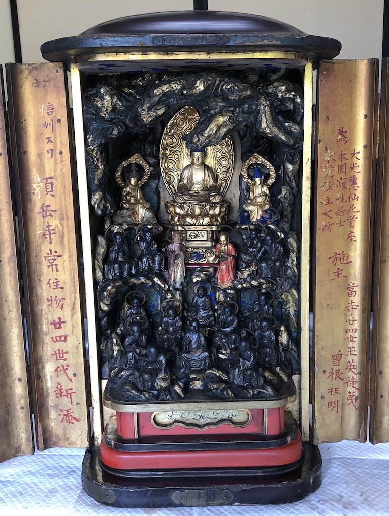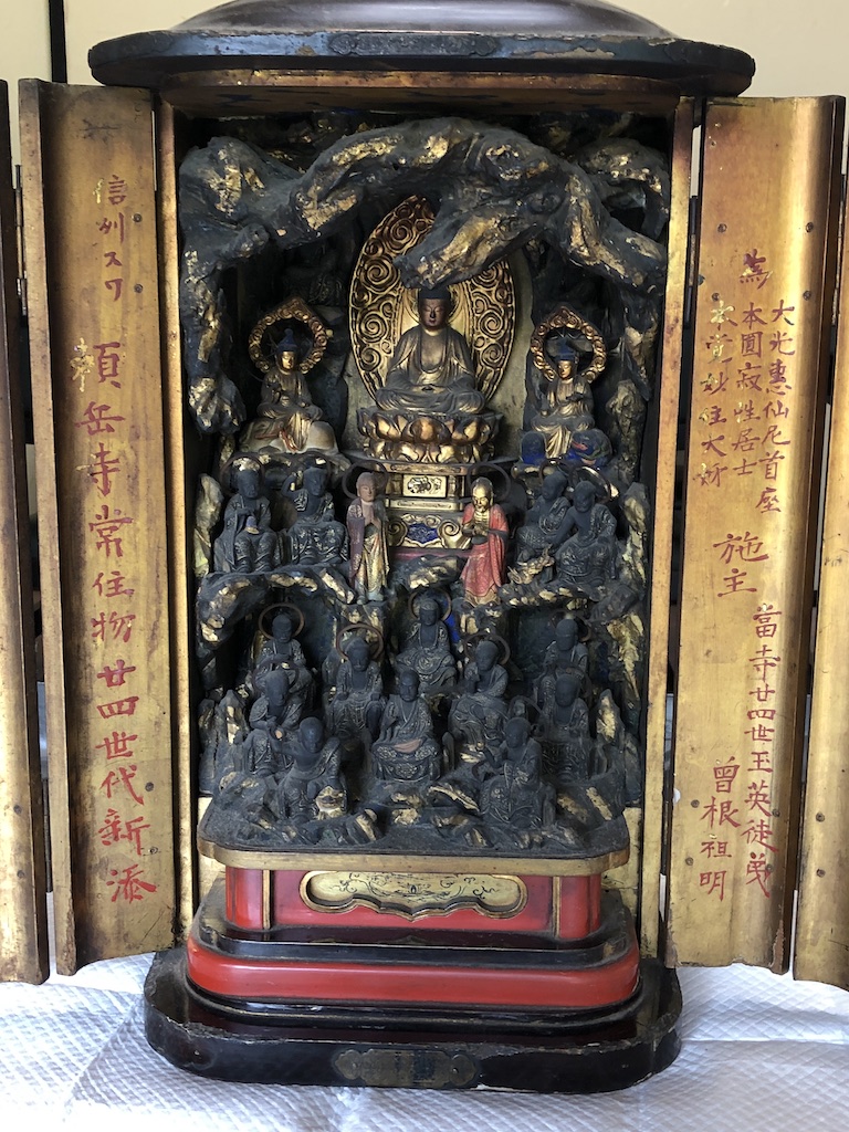 茅野市頼岳寺様から、頼岳寺第24世の徒弟の方から贈られた16羅漢像の洗浄依頼がきました。代々の住職が伝えている大事なものだからしっかり頼むよと言われかなり緊張して作業しました。そうでなくても、「大寺で末寺が沢山あって失敗すれば長野では2度と作業できないし、うまくすればきっと沢山依頼が来ると思うよ。」と言われていたのでいつも以上に慎重に作業を行いました。大寺も大寺。諏訪氏の菩提寺でした。以前武田信玄の菩提寺である恵林寺さんでも作業したので何かの縁を感じます。厨子の扉部分に徒弟さんからいただいた名前とか時代が書かれていましたが、これは明らかに浮いていたので洗浄はできませんとはっきりと断りました。こういった加減が大事だと思っています。彩色はところどころ浮いているところがあったので、これ以上劣化の進まないように処置しておきました。喜んでおられたのでこれから長野方面も仕事が増えると期待しています。