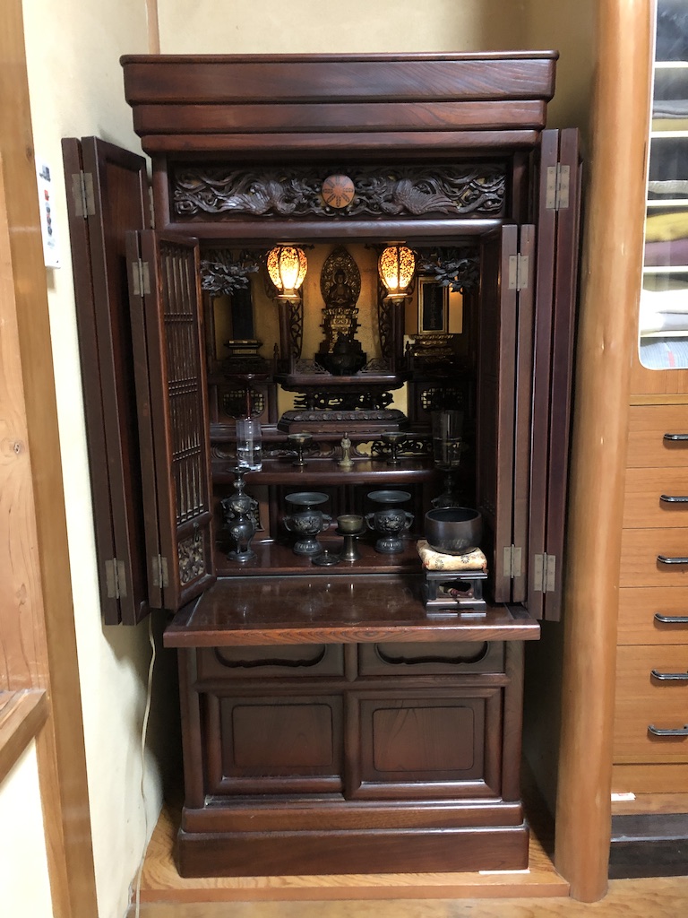 お父様が亡くなられた時に購入された仏壇でした。この度お母様が亡くなられたのでお母様の入るお家を綺麗にして欲しいとご依頼がありました。かなり一生懸命お勤めされたらしくかなり線香の汚れが付着していました。家紋も綺麗に浮かびあがり、仏壇も本来ある木目や色に戻りました。施主様も大変喜ばれておりました。
