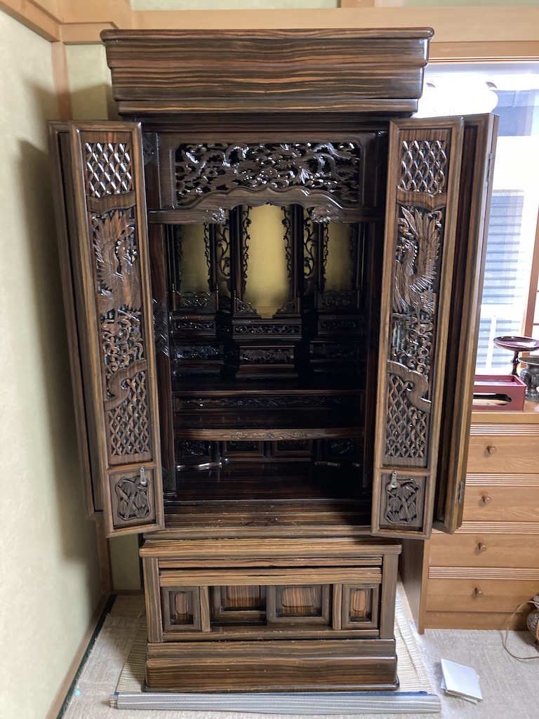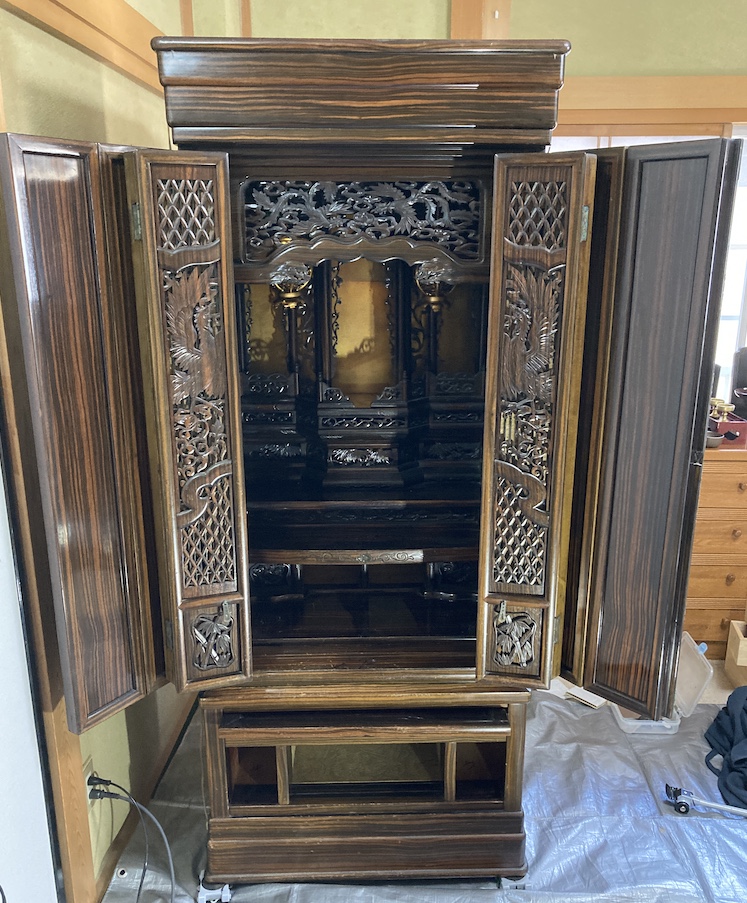 大好きな旦那様が亡くなられて気落ちしてましたが、綺麗好きなご主人様だったそうで49日前に新仏さまが入る仏壇を綺麗にしてほしいとご依頼がありました。50年以上経過している割りには綺麗だなと思ったのですが、旦那さんが職人だったらしく色々と手を加えられとおりました。一番驚いたのは中扉の網戸(紋紗)が障子紙に交換されてたことです。普通はここまで素人さんが手を入れることはないです。ただ紙でしたので燻んで穴が空いてましたので新品の紋紗に入れ替えて、背板の金紙も交換しました。写真ではわかりづらいですが、奥様は綺麗に蘇り大変喜んでおられました。