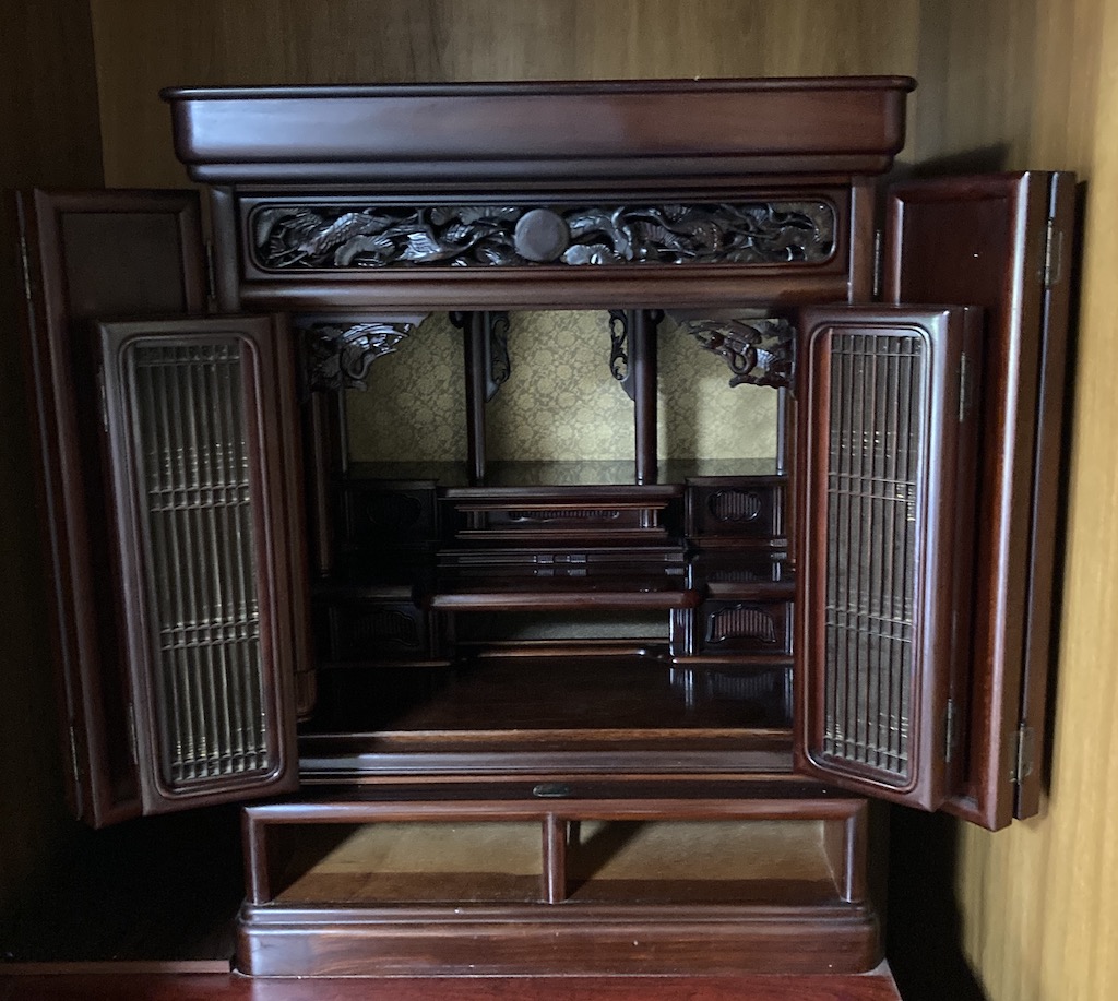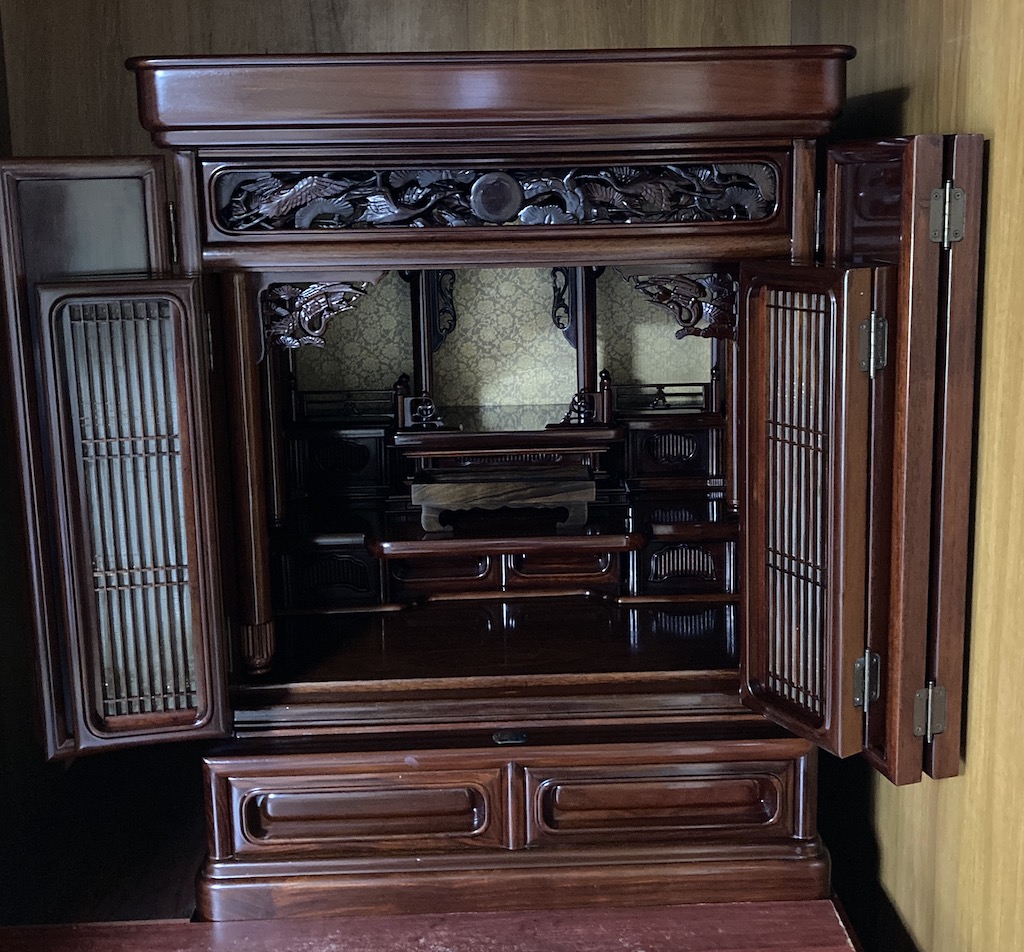 仏壇クリーニング 関根様 befor after新盆前に仏壇を綺麗にしてほしい 関根様は旦那様が亡くなられて初めてお盆を迎えるにあたって仏壇を綺麗にしたいと思っていたそうです。コロナがあったので少し落ち着いた頃にと思っていたらまた第二波がやってきたのでお盆前に早速連絡をいただきました。お舅さんが買われた仏壇で、あまりお金を掛けてない仏壇かもしれないよと言われていましたが、立派な紫檀の仏壇でした。仏壇にはお金をかけていたみたいです。毎日のお勤めをきちんとされていたらしくお線香でくすんでおりました。目の前で汚れを取って見せるとびっくりされて頼んで良かったと言われておりました。