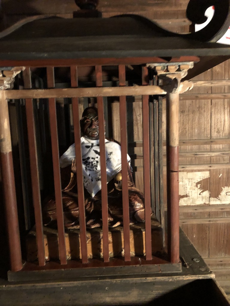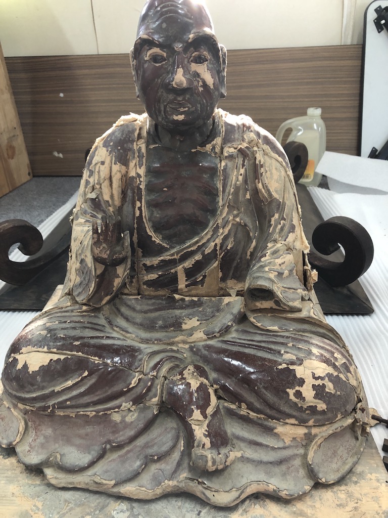 800年以上続いている本堂内に安置されていた賓頭盧尊者像です。何百年か経っていると思いますが文献が出なかったのでわかりません。今まで様々な方から厄除け(病避け)で触られていたそうでほぼバラバラな感じで頭も胴体内部にチョコっと置かれているようでした。この状態は新品仕上げとかしないと厳しいとご提案しましたが、この歴史を感じさせる仕上げ方を何とかして欲しいと依頼されました。パズルのような部品を組み上げ何とか形にしてその後は、色をつけすぎないように違和感なく色を補いました。これでまた撫でられても大丈夫なはずです。私も喉のあたりを撫でさせてもらいました。ありがとうございました。