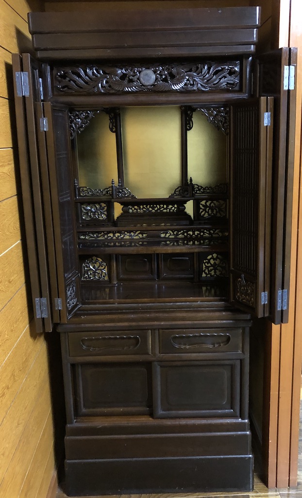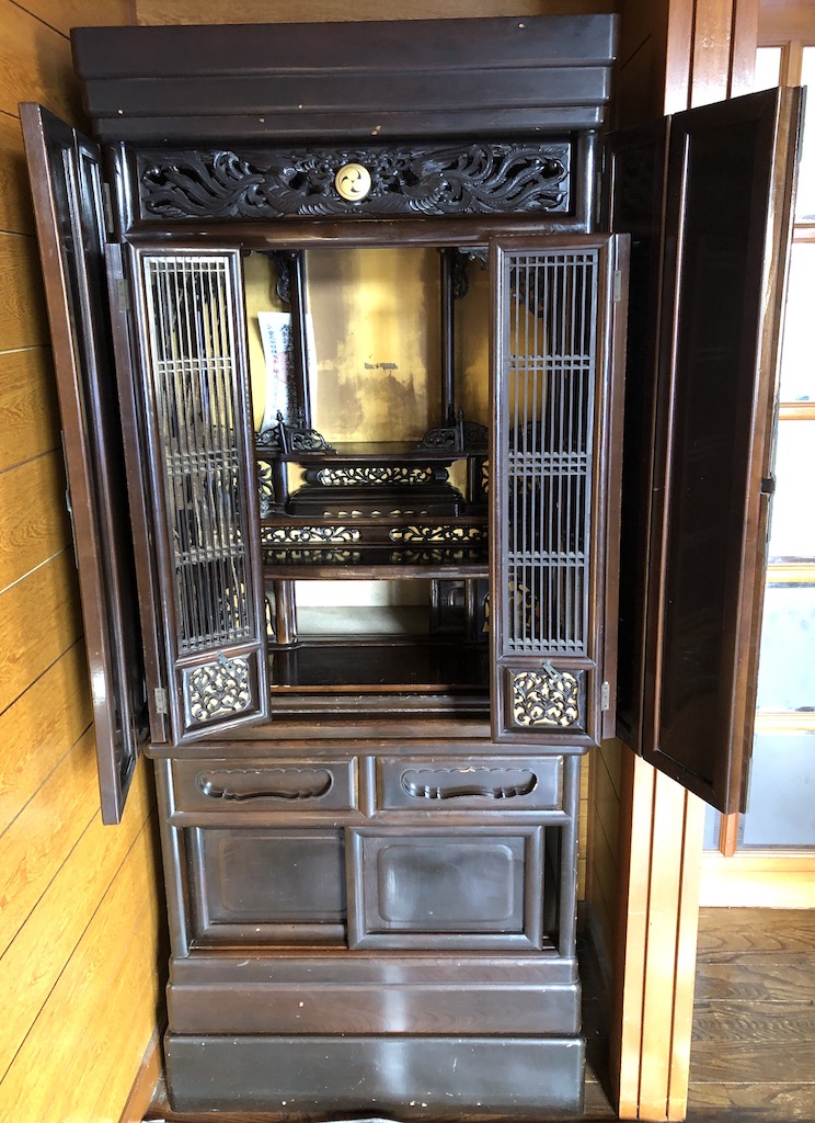 仏壇を綺麗にしたいとお寺さんに相談したところ上田さんって綺麗に出来る人がいるよと紹介されて私が訪問することになりました。パッとみたところかなり傷みが激しく、鉄砲虫が出た穴、紗はボロボロ、金紙の破れなどあり、お洗濯に近い感じだと思われました。予算はあまり無いと言うことでしたのでクリーニングで何とかしようということになりました。穴はパテで塞いで黒く塗り、紗の交換、金紙の交換、格子の直しなど行いかなり綺麗になりました。お寺さんの紹介ですのでいつも以上に気合を