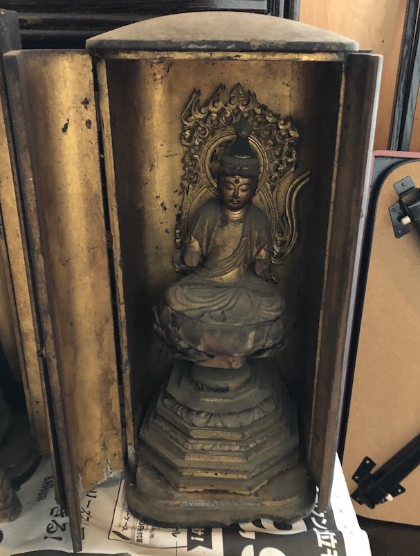 高野山真言宗 薬王寺様 大日如来像お洗濯 befor after長年の懸念であったお大日如来像をきれいにして欲しい 長年本堂裏の位牌堂に安置されていた大日如来像です。こちらの厨子のも扉は外れて半分紛失したり、腕がなかったり傷みが激しかったです。当初、クリーニングでなんとか古いままで仕上げられないかとご依頼がありましたがさすがに無理でした。すっかり生まれ変わり持物も全て揃ってまたお寺様で檀家さんたちを御護りしてくれるでしょう。喜んでいただいてよかったです。