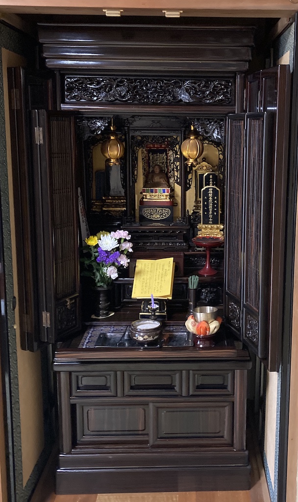 45年前にお舅さんが亡くなられた時に購入したお仏壇でした。現在85才の島崎さんは2才でお母さん、12才でお父さんが亡くなられ結婚してからお姑さんのことを本当のお母さんのように接しられ色々とお姑さんから教えられたそうです。お姑さんがすごく大切にしていた仏壇なので私が生きている間に綺麗にして欲しいと依頼がありました。三方金の金紙がありましたのでどうしようかと思いましたが(側面がバラせないので側面の金紙を交換出来ない)、結構丈夫な金紙を使用していたので交換せず洗浄だけで違和感なく綺麗にすることが出来ました。あと色々と傷んでいたので接着したり色々しておきました。喜んでいただいて本当に良かったです。ありがとうございました。
