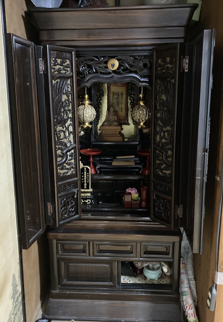 名前からして山梨の方かなと思ったらやはりそうでした。旦那さんが身延町、奥さんが中富町。山梨を出られてから50年近くとの事でした。お仏壇を購入したシールがあり今もある仏壇店から購入したみたいです。網戸の汚れと全体の汚れが気になるのできれいにしてから旦那さんを送りたいとの事なので一生懸命きれいにさせてもらいました。その後、暗がりの奥まったところに設置されているのでみんなの目のつくところに移動して欲しいとのことでしたので武器を使用して移動しておきました。とても喜んでいただきました。ありがとうございました。