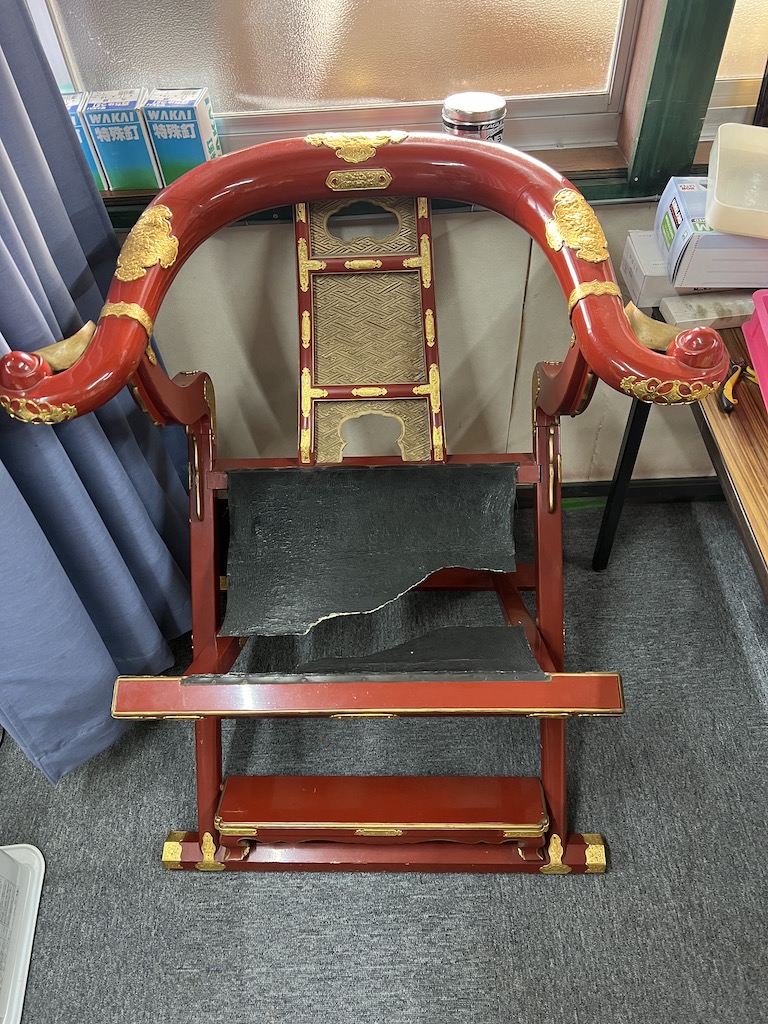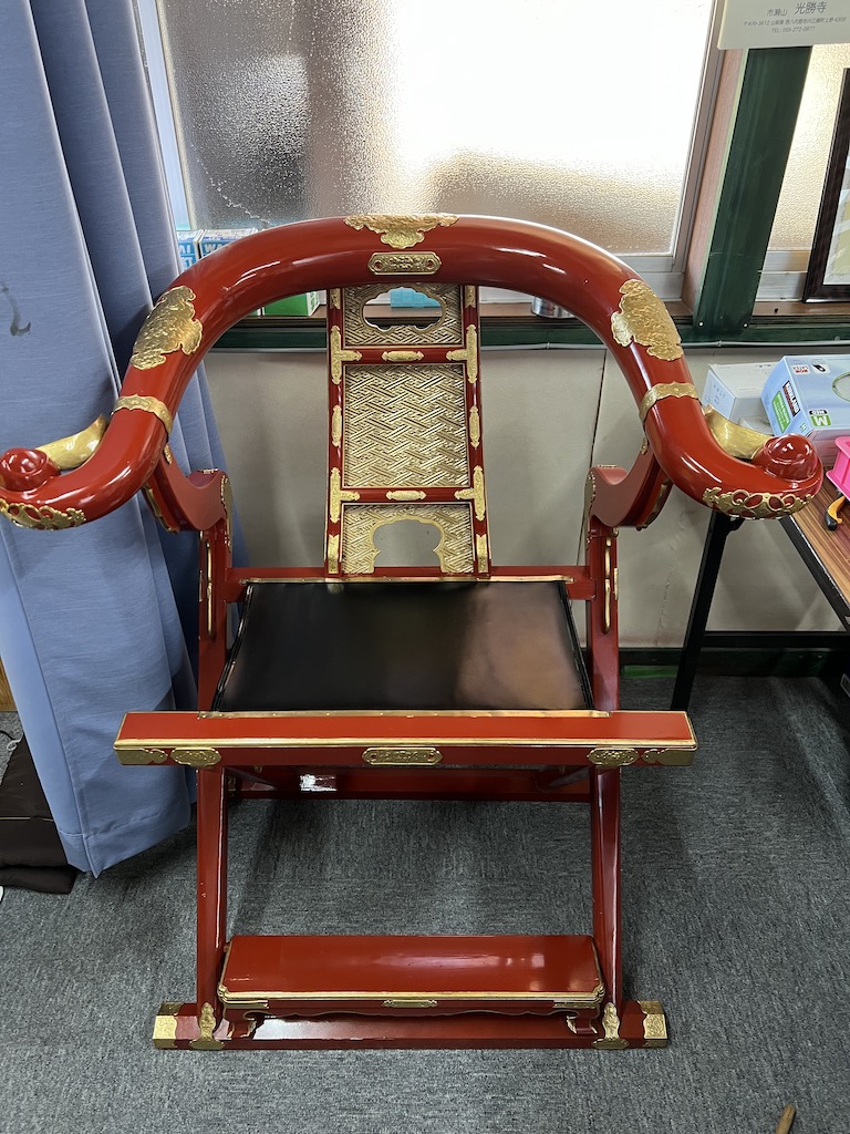 曹洞宗増泉寺様 曲椂修理 befor after曲椂の革張りをしてほしい 瓔珞糸替えの合間に頼まれていた曲椂の革張り替えをしました。前に直してもらったそうですが、金具のサイズが合ってなくて日焼けしたところがくっきり残ってたり元の釘穴が見えたりしてました。直したの誰?素人さんが直したみたいな感じでした。言われてませんでしたが光沢を出して目立たなくなるようにしておきました。