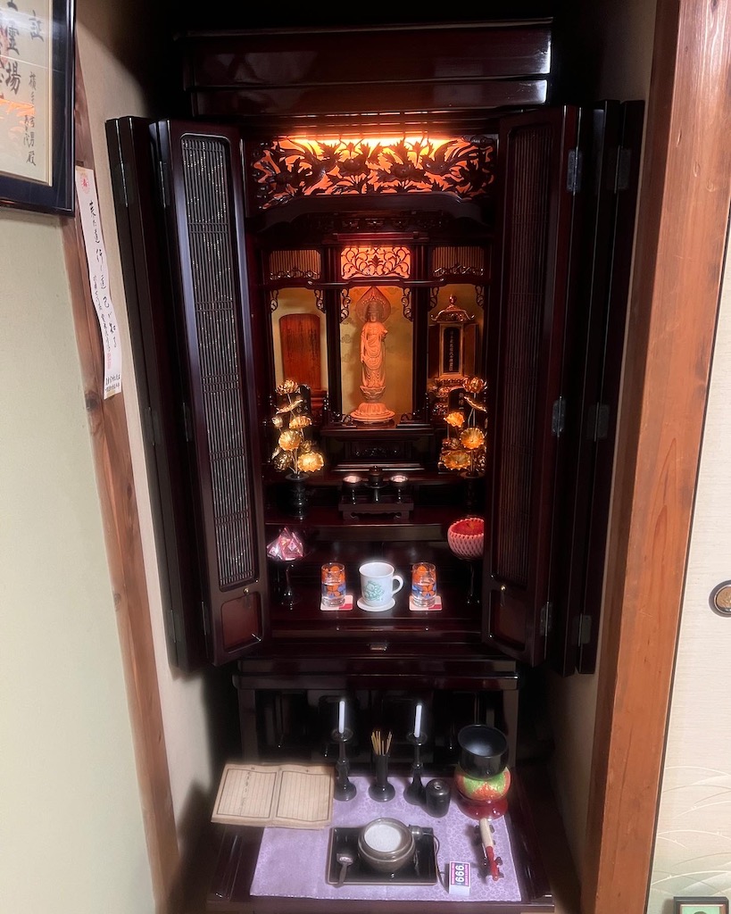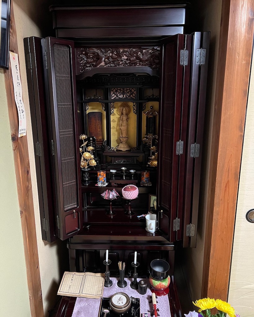 綺麗好きな旦那さんが突然亡くなられたそうです。仏壇を綺麗にしてから送ってあげたいと洗浄のご依頼を頂きました。デザイン重視の黒檀仏壇でかなり珍しかったです。欄間の後ろに紙が貼ってあったり須弥壇が照らさせるようにライトがあったり。鈑金の職人さんだったそうでかなり手先が器用な方でした。一枚の銅板から五重塔を作ったり色々作品がありました。帰りの車の中であの紙ももしかしたら旦那さんが貼ったのかも知れないなと普通ないからなと感じました。綺麗になって皆さん喜んでおられました。ありがとうございました。