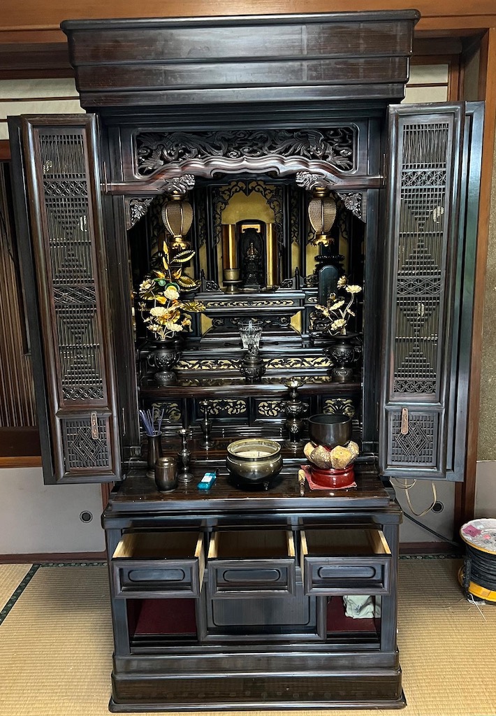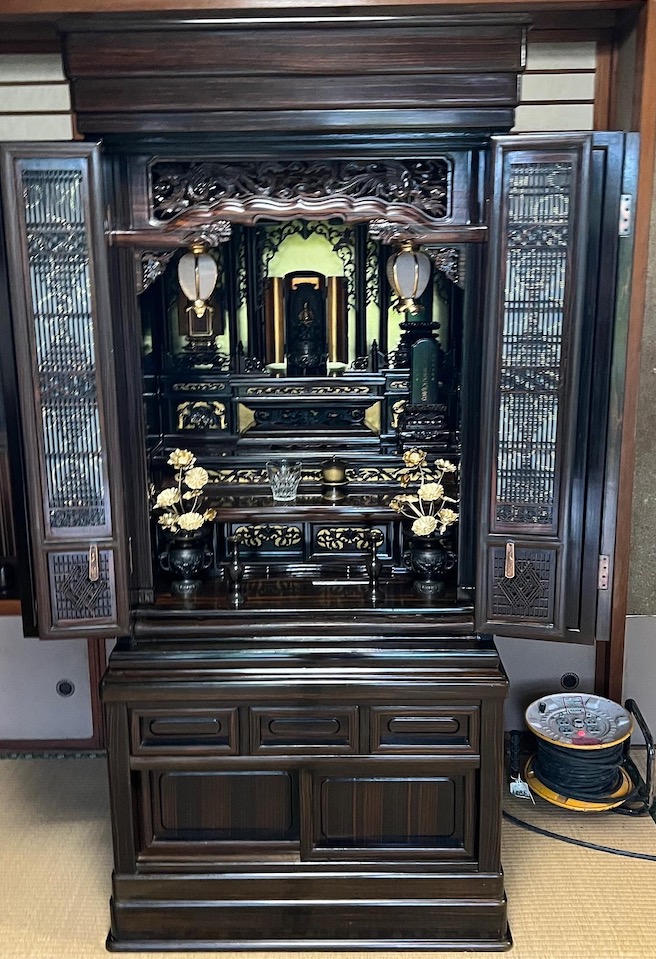 仏壇クリーニング 宮岡様 befor after引っ越しするので綺麗にしてから運びたい 長年実家に置いてあった仏壇を新居に移動するにあたり綺麗にしてほしいとご依頼がありました。毎日線香を炊いていたそうで黒檀の木目がわからないくらい汚れていました。施主さんの目の前で汚れを落としてみるとビックリしていました。洗浄、紗の交換、金紙の交換をして蘇るとたいへん喜んでおられました。ありがとうございました。