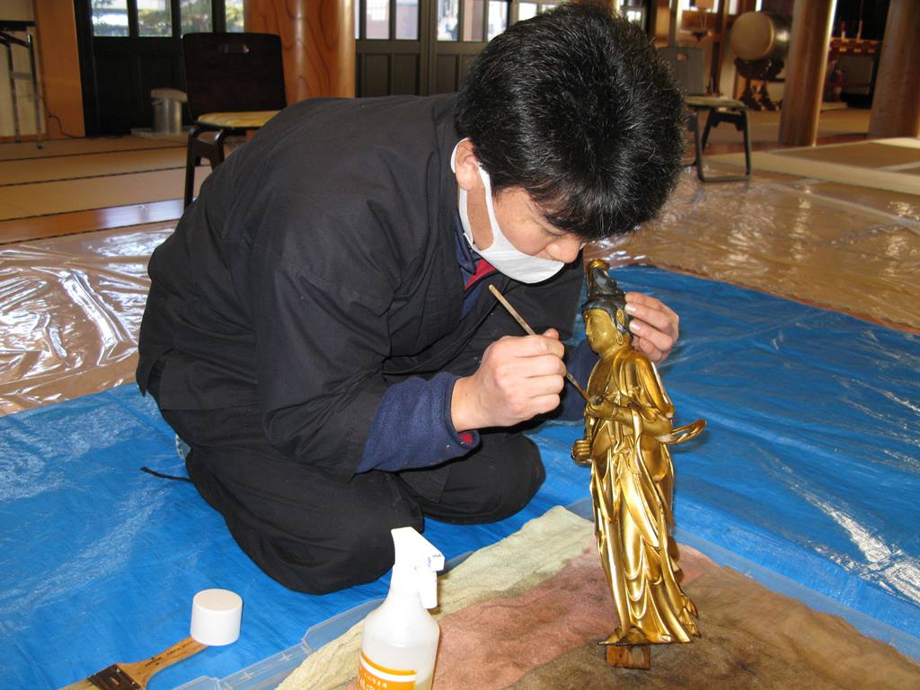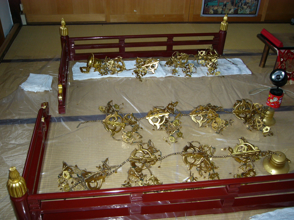 - 仏像、おりん、灯篭、天蓋、幢幡、燭台、香炉等を洗浄・つや出しを施します。