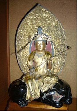全体を綺麗にして欲しいとのご依頼でした。金箔と金具は洗浄でここまで綺麗になりました。普賢菩薩様の乗っている像は白像が多いのですが、花園院様は漆塗りの黒像でした。漆専用の磨き粉を使用すれば、ここまで蘇らせることが出来ます。